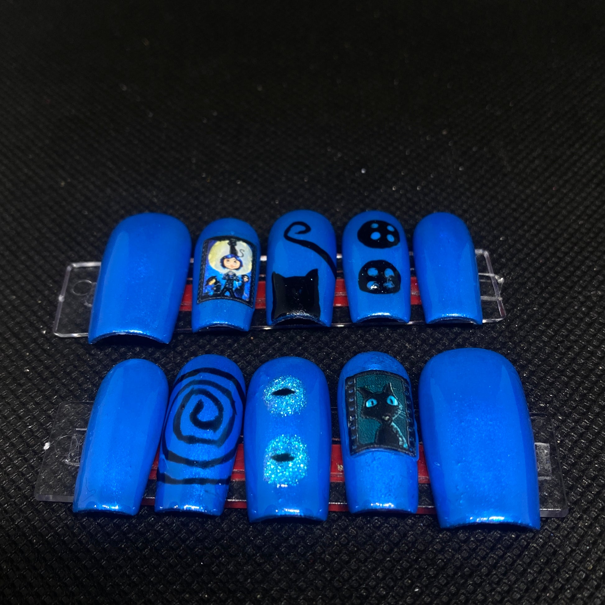 Coraline themed square shaped nails- Can be made in ALL sizes
