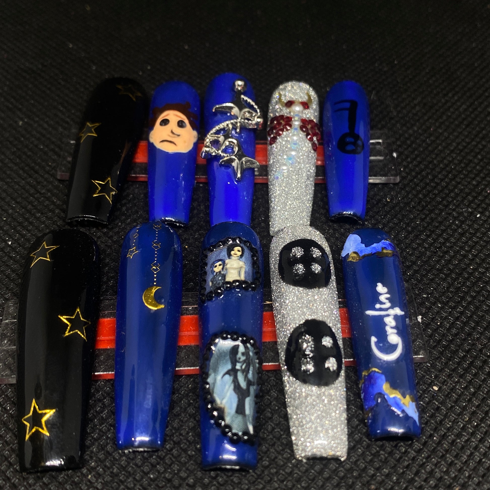 Coraline themed XL coffin shaped nails- Can be made in ALL sizes - can also be made shorter