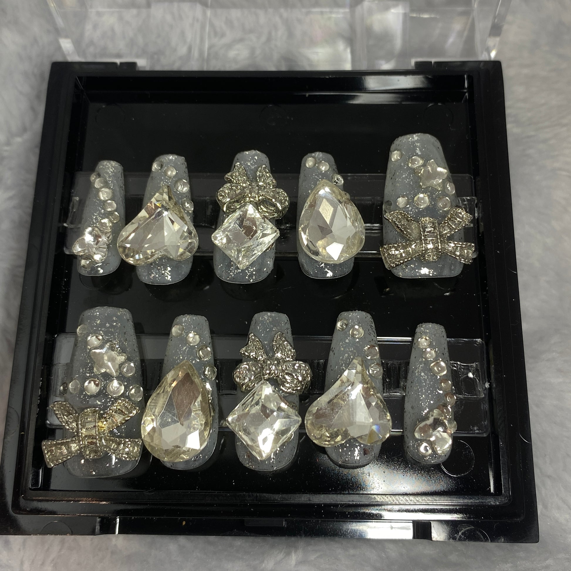 White glitter coffin shaped nails with crystal like charms and decor in a small size
