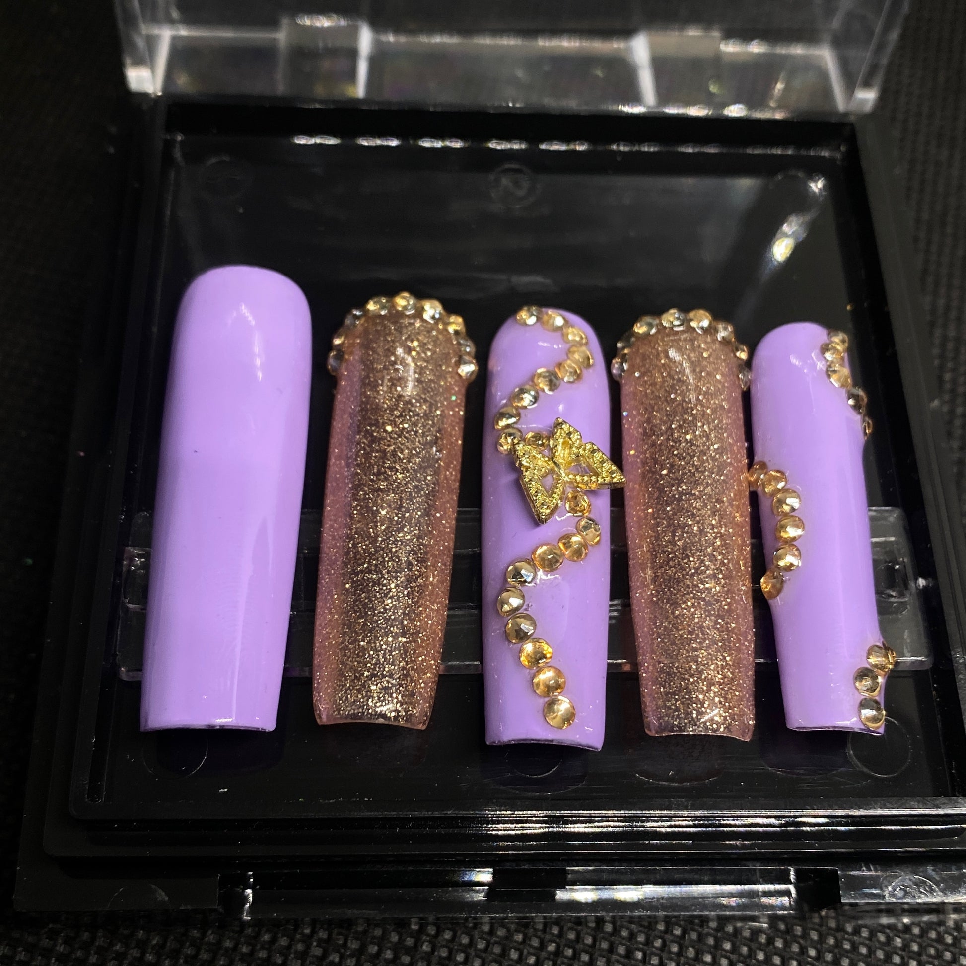 Purple and gold square shaped nails with butterfly charms- available sizes; Small, Medium