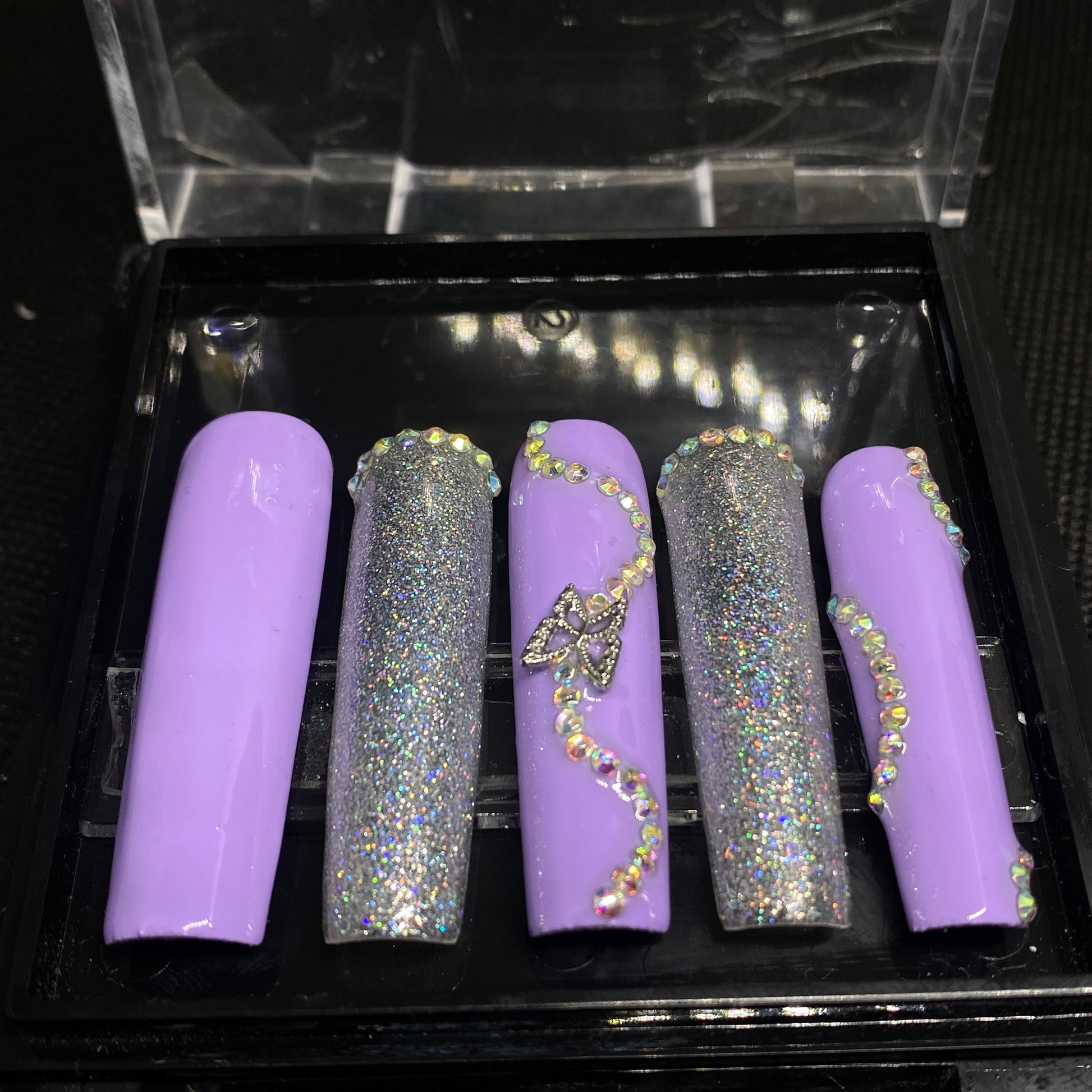 Purple and silver square shaped nails with butterfly charms- available sizes; Small, Medium